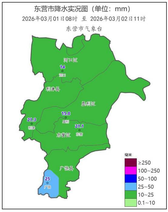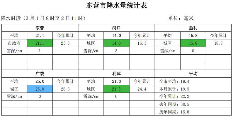 齐鲁网·闪电新闻3月2日讯 东营市气象局、东营市水文中心、东营市水务局3月2日11时发布雨雪情通报信息:3月1日8时至2日11时全市平均降水量19.4毫米,前期以雨为主,后期转为降雪,降水过程包含雨雪相态转换,最大广饶城区25.0毫米。今年全市累计平均22.2毫米,比去年同期(30.5)偏少8.3毫米,较常年(15.8)偏多6.4毫米。