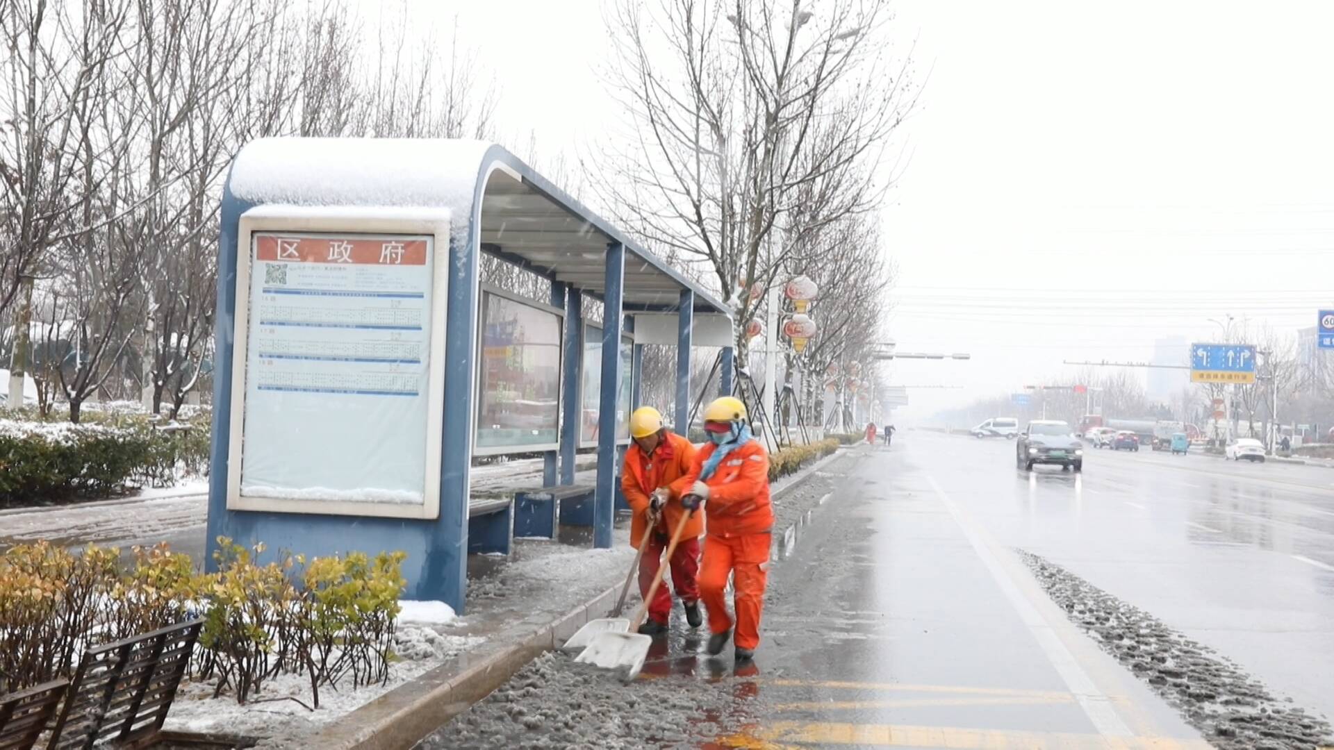 上午九点,记者在东营市河口区黄河路、海宁路等主干道看到,大型雪滚车正在对路面进行不间断清扫;环卫工人则手持铁锹、扫帚,重点攻坚人行道、公交站点和校园周边等机械作业盲区。